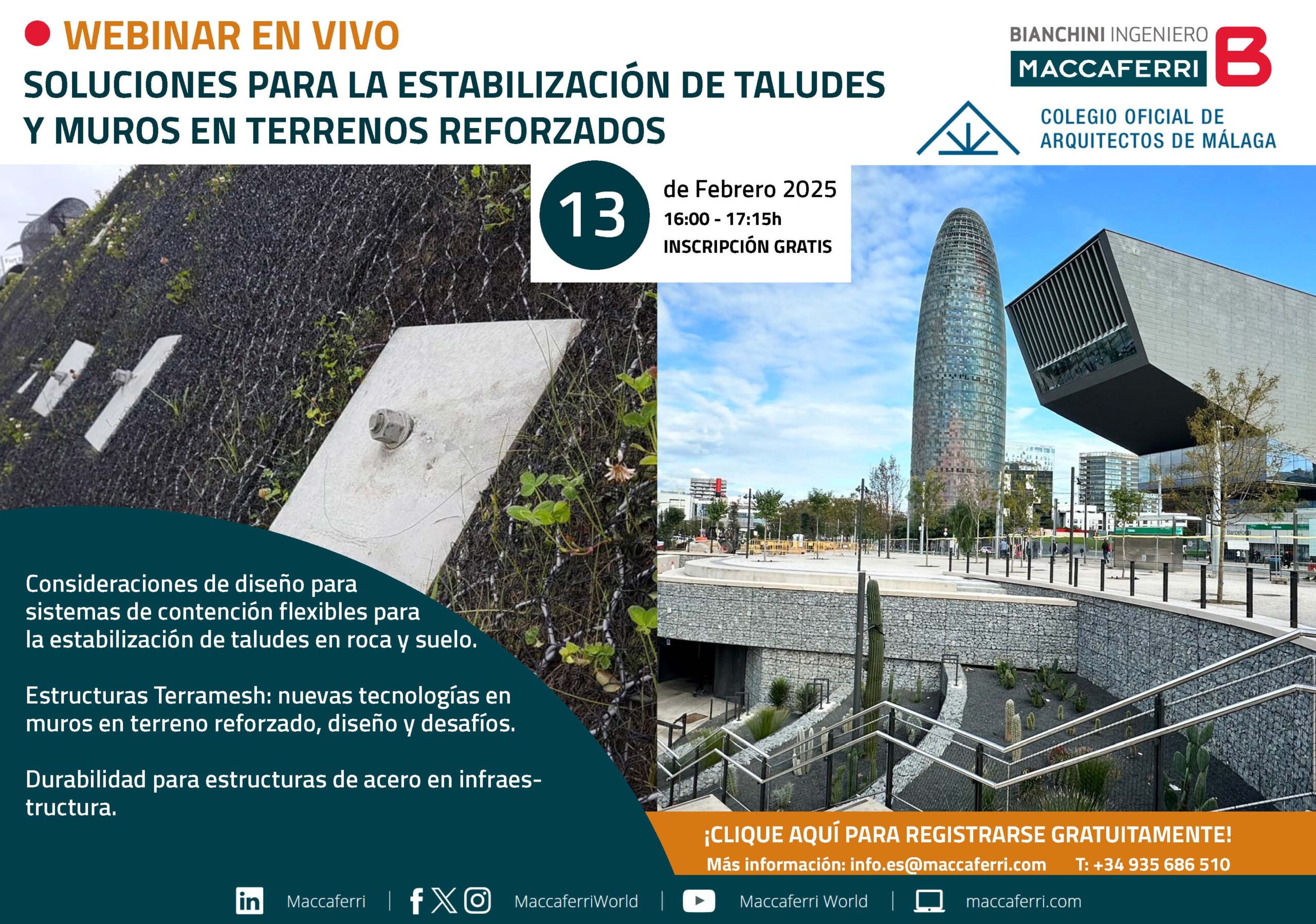 En esta jornada, organizada por Bianchini Ingeniero – Maccaferri en colaboración con el COA de Málaga, se explicarán las consideraciones de diseño en sistemas de contención flexibles para la estabilización de taludes en roca y suelo. También se explicarán las estructuras Terramesh: nuevas tecnologías para muros en terreno reforzado, diseño y desafíos y se abordará la durabilidad de las estructuras de acero en infraestructuras.