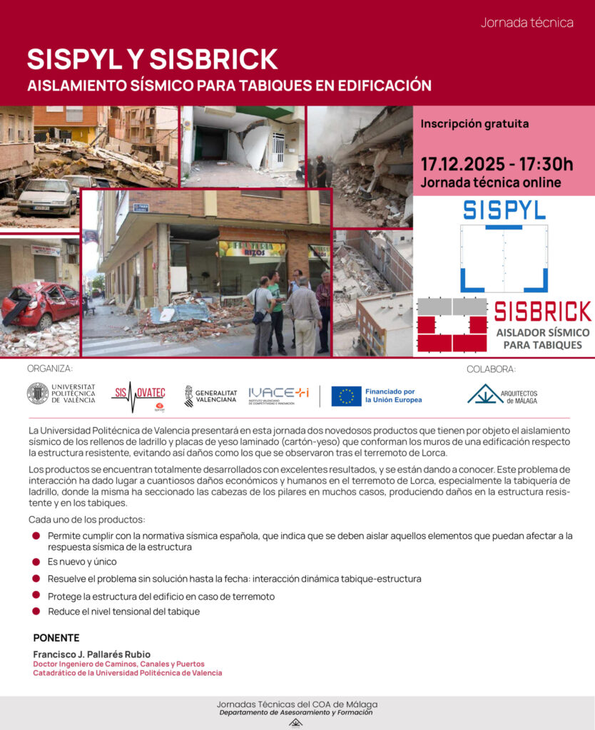 El próximo 17 de diciembre, a las 17,30h, tendrá lugar la jornada técnica online «Sispyl y Sisbrick. Aislamiento sísmico para tabiques en la edificación» en la que la Universidad Politécnica de Valencia presentará dos novedosos productos que tienen por objeto el aislamiento sísmico de los rellenos de ladrillo y placas de yeso laminado que conforman los muros de una edificación respecto de la estructura resistente.