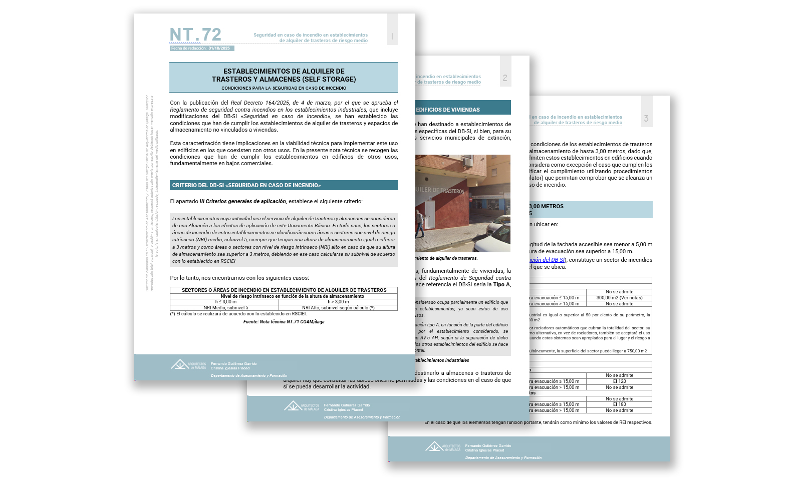 En la nota técnica de edificación 72 se recogen las condiciones generales que han de cumplir los establecimientos de trasteros de alquiler que se proyecten en edificios de otros usos, de acuerdo con las últimas modificaciones del DB-SI «Seguridad en caso de incendio» y el nuevo Reglamento de Seguridad contra Incendios en Establecimientos Industriales.