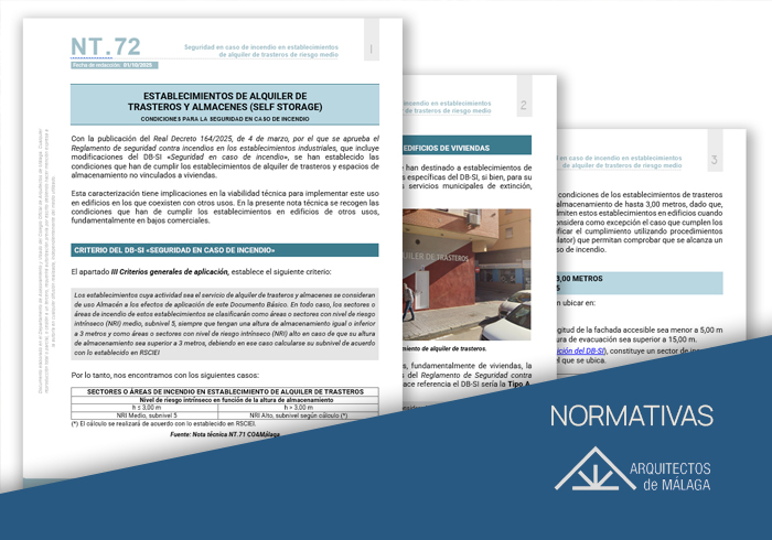 En la nota técnica de edificación 72 se recogen las condiciones generales que han de cumplir los establecimientos de trasteros de alquiler que se proyecten en edificios de otros usos, de acuerdo con las últimas modificaciones del DB-SI «Seguridad en caso de incendio» y el nuevo Reglamento de Seguridad contra Incendios en Establecimientos Industriales.